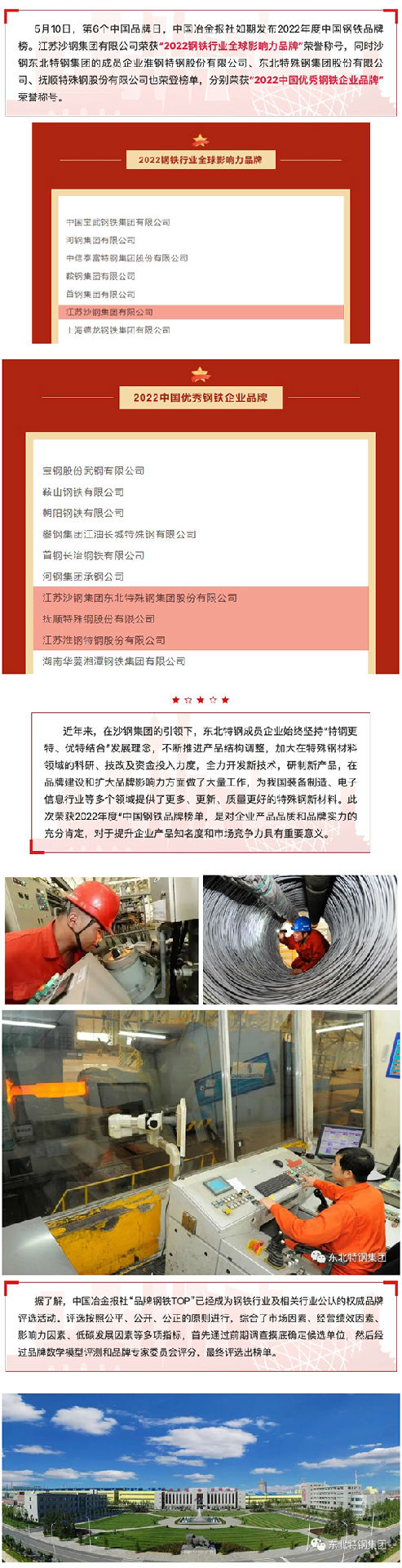 沙鋼東北特鋼集團(tuán)榮登2022中國(guó)鋼鐵品牌榜單