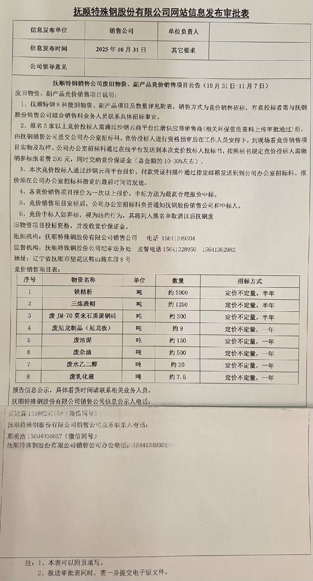 撫順特鋼銷售公司廢舊物資、副產(chǎn)品競價銷售項目公告(10月31日-11月7日