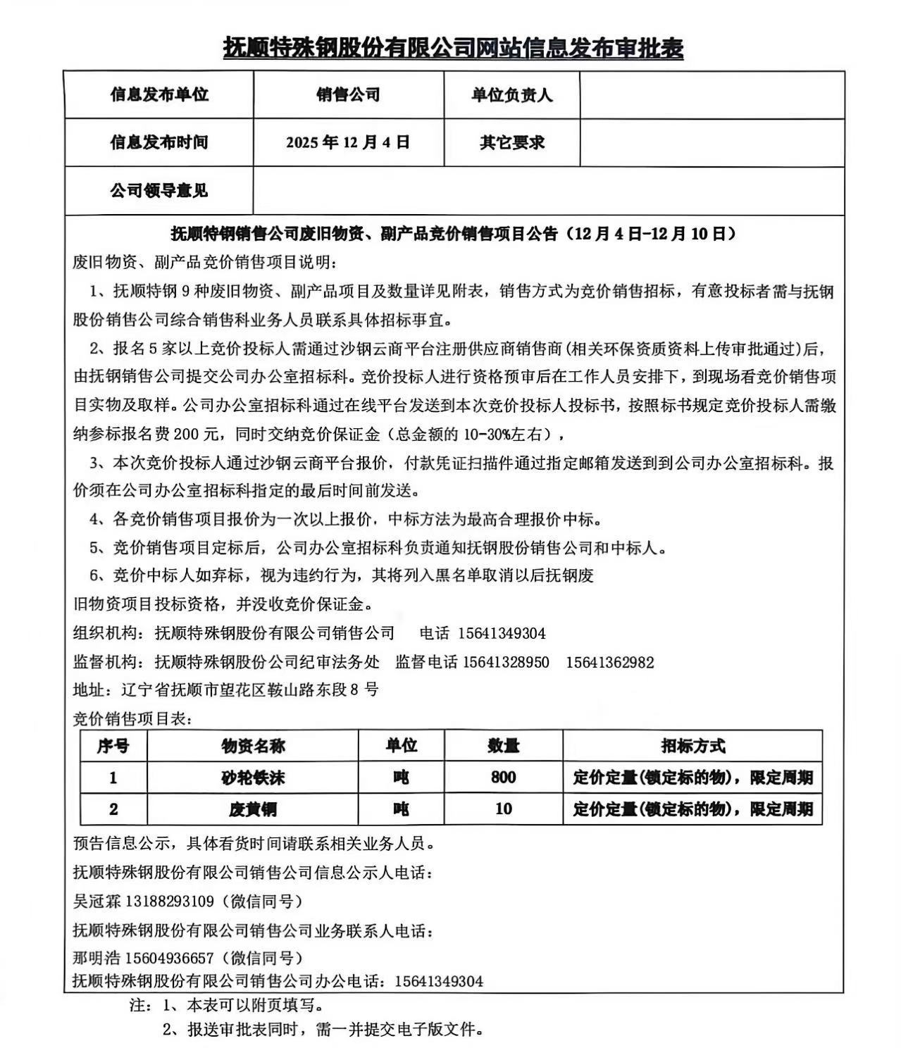 撫順特鋼銷(xiāo)售公司廢舊物資、副產(chǎn)品競(jìng)價(jià)銷(xiāo)售項(xiàng)目公告(12月4日-12月10日)