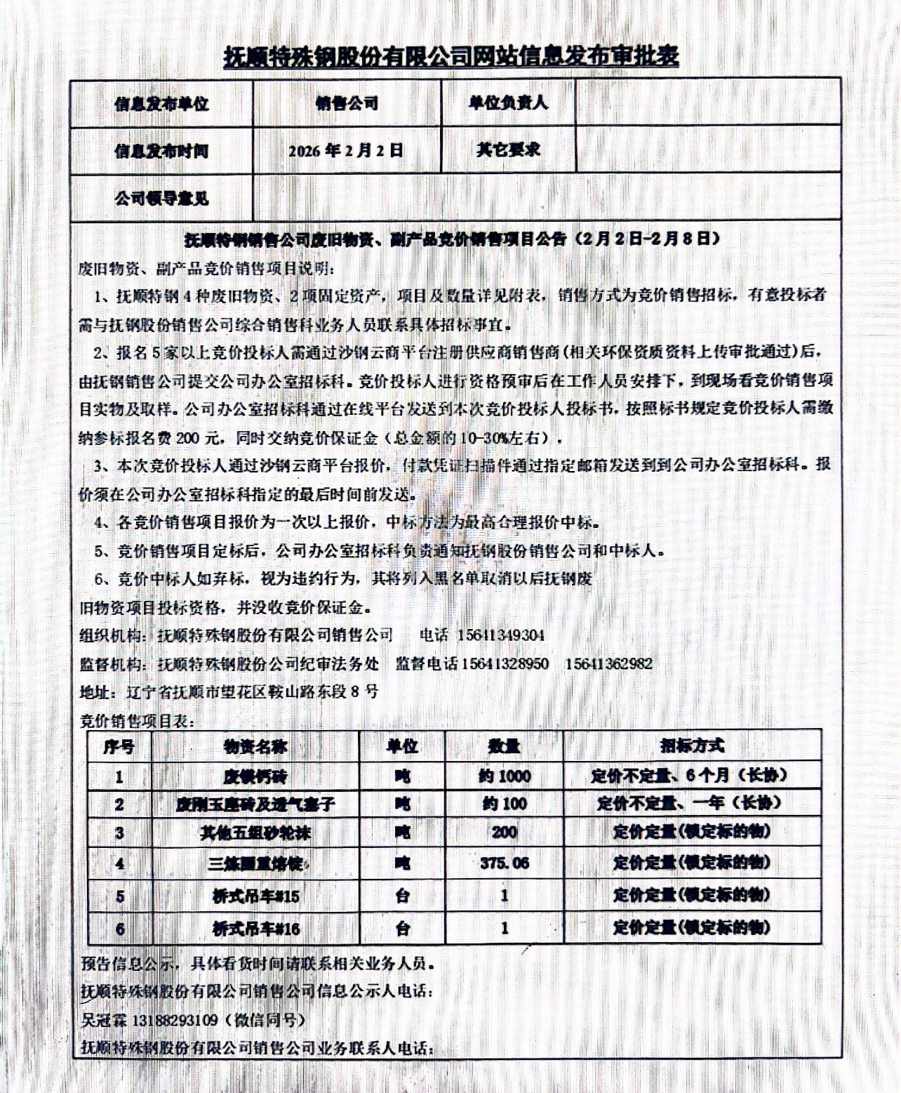 撫順特鋼銷售公司廢舊物資、副產(chǎn)品競價銷售項目公告(2月2日-2月8日)