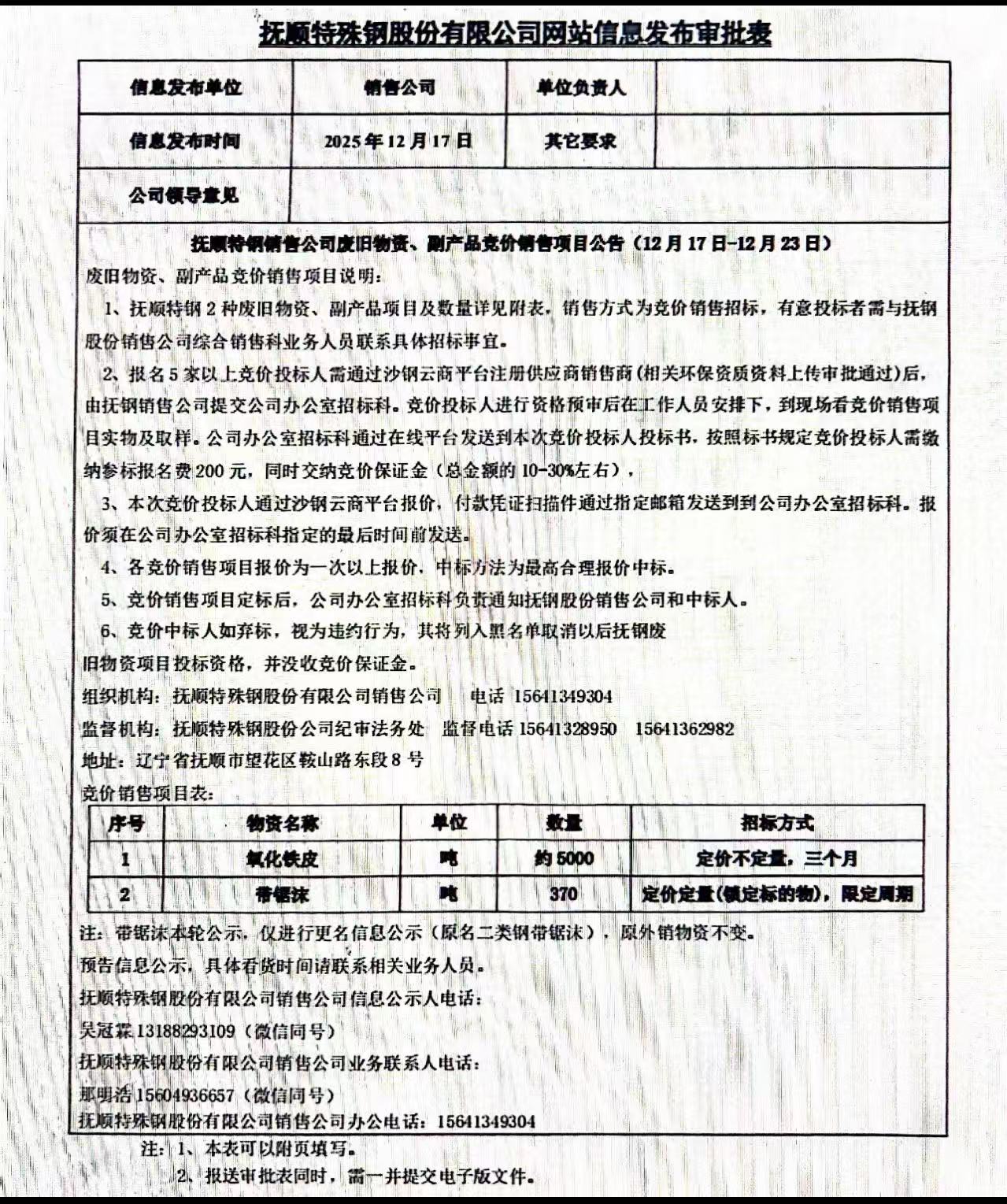 撫順特鋼銷售公司廢舊物資、副產(chǎn)品競價銷售項目公告(12月17日-12月23日)