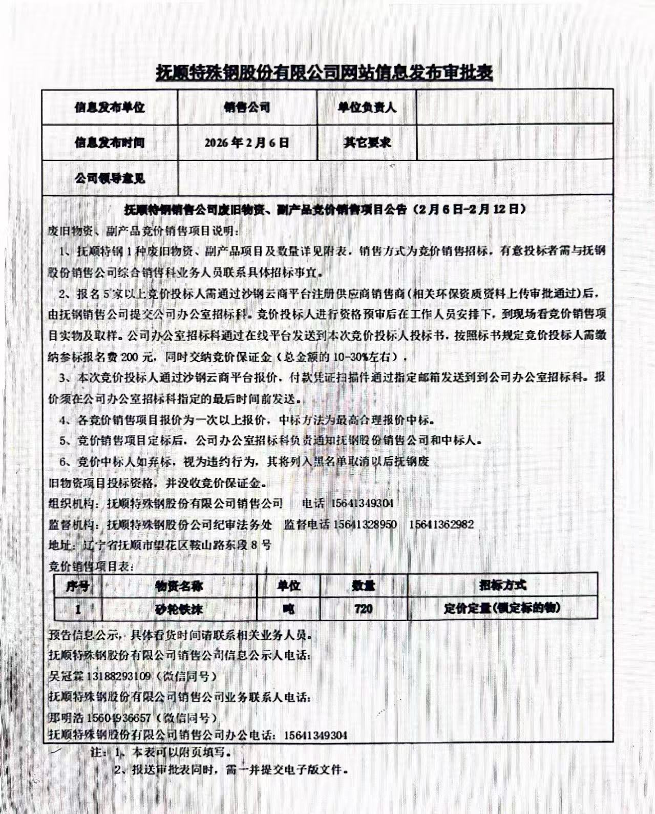 撫順特鋼銷售公司廢舊物資、副產(chǎn)品競價銷售項目公告(2月6日-2月12日)